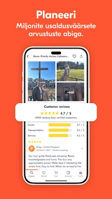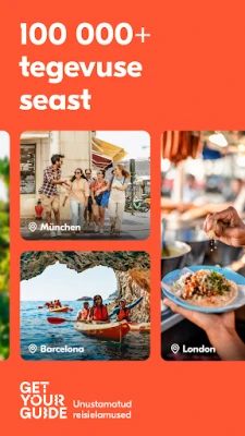 Avasta maailm oma tingimustel GetYourGuide'i äpiga, mis muudab unustamatute reisielamuste planeerimise ja broneerimise imelihtsaks. Olenemata sellest, kas unistad ammuoodatud puhkusest või otsid spontaanselt tegevusi viimase minuti reisil, pakub GetYourGuide piiramatult võimalusi. Vali laia kultuuri-, gastronoomia-, seiklus-, loodus- ja muu temaatilise valiku hulgast, et iga hetk oleks täidetud just sinu soovide kohaselt.