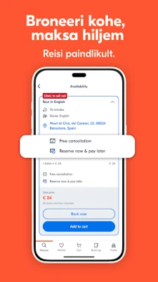 Reisi paindlikult ja rahuliku südamega tänu GetYourGuide'i mugavatele funktsioonidele. Kindlusta endale koht populaarsetel elamustel võimalusega broneerida kohe ja tasuda hiljem. Kohesed kinnitused tagavad, et sinu piletid on alati hetkega käes, olgu tegemist etteplaneeritud tegevuse või spontaanse otsusega. Lisaks on sul võimalus hoida oma piletid ja broneeringuinfo käepärast ka võrguühenduseta, vältides igasugust stressi.
