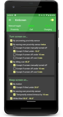 Kas olete tüdinud pidevast toitenuppu vajutamisest või sellest, et ekraan kustub just siis, kui seda kõige rohkem vajate? KinScreen pakub nutikat lahendust, mis automatiseerib teie telefoni ekraani käitumist, muutes selle kasutamise märkimisväärselt mugavamaks ja intuitiivsemaks. Alates 2014. aastast pidevalt täiustatud rakendus on loodud mõistma teie vajadusi ja reageerima intuitiivselt. Unustage tüütud seaded ja nautige sujuvat kogemust – KinScreen äratab ekraani ellu täpselt siis, kui seda soovite, ja lülitab selle välja, kui see pole enam vajalik.