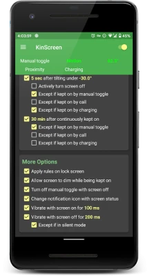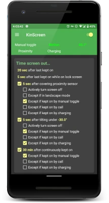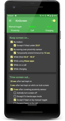 KinScreen hoiab automaatselt sinu ekraani sees, kui telefoni aktiivselt kasutad, et vältida pidevat puudutamist. Kui sa seda ei kasuta, lülitab KinScreen ekraani kiiremini välja, säästes väärtuslikku akut. Lülita ekraan sisse ka ilma toitenuputa.