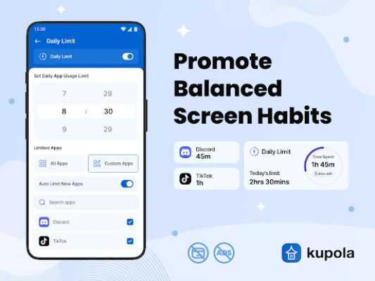 Lisaks füüsilisele turvalisusele aitab Kupola kujundada ka vastutustundlikku digitaalset käitumist. Blokeerige kergesti sobimatud veebisaidid ja rakendused, rakendage veebifiltreid ja SafeSearchi funktsiooni, et kaitsta lapsi soovimatu sisu eest. Koostage paindlikud ekraaniaja graafikud, mis arvestavad kooli, õhtusöögi ja uneaega, ning jälgige rakenduste kasutust üksikasjalike aruannete abil, et mõista lapse digitaalset teekonda. Positiivse käitumise innustamiseks pakub Kupola ka ülesannete ja preemiate süsteemi, kus lapsed saavad teenida lisaminuteid ekraaniajast, õppides samal ajal vastutustundlikkust. Kupola on loodud lihtsa ja intuitiivse kasutajaliidesega, mis teeb selle igapäevase haldamise vaevatuks.