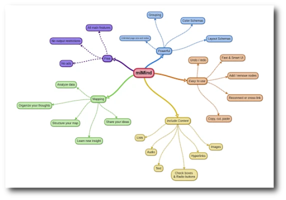 miMind on võimas tööriist mõtete ja skeemide organiseerimiseks ning jagamiseks. Looge lihtsaid nimekirju või keerukaid insenerikontseptsioone. Avastage kümneid paigutusi, värviskeeme ja kujundeid. Jagage oma kaarte pildi, PDF-i või tekstina.